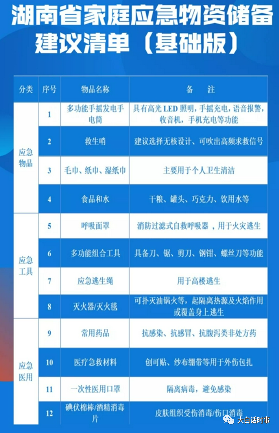 比如说,像湖南省的家庭应急物资储备建议清单如下。