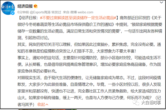 所以,到了中午的时候,一些媒体也开始出来做一些澄清报道,称“不要过度解读甚至误读储存一定生活必需品”。