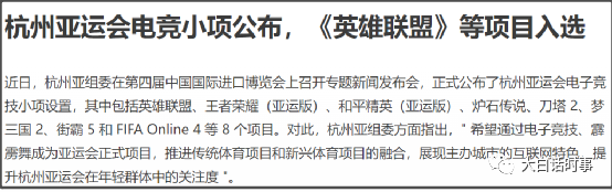 最近杭州亚运会也公布了2022年亚运会的电子竞技大项目下的细分小项,其中包括英雄联盟、王者荣耀、和平精英、炉石传说、刀塔2等8个热门游戏。