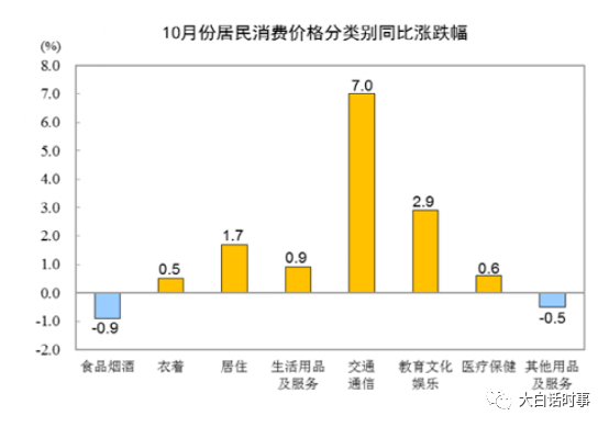 10月份CPI的大类同比涨幅里,交通通信的同比涨幅最大,达到了7%的同比增长。