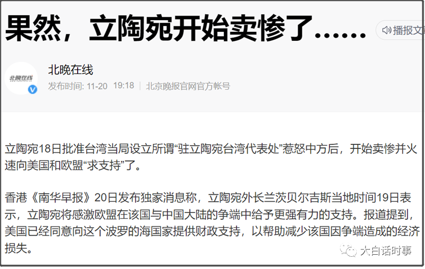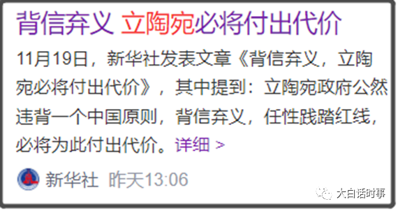 这是严重违背“一个中国”原则,严重违反立陶宛当初跟我们建交时做出的承诺,所以在11月19日,我们媒体是对立陶宛此举进行比较严厉的抨击,像新华社就发表文章,标题为《背信弃义,立陶宛必将付出代价》。