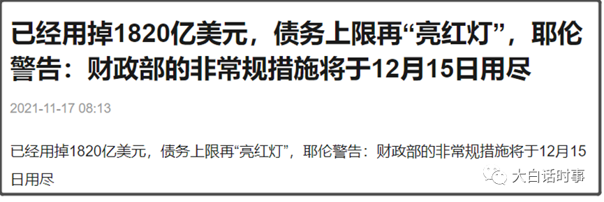 哦对了,耶伦最近又跑出来恐吓美国将债务违约,称美国刚提高的债务上限,又要触发上限了,美国财政部的资金将在12月15日耗尽,需要美国国会在12月15日之前,大幅度提高债务上限。