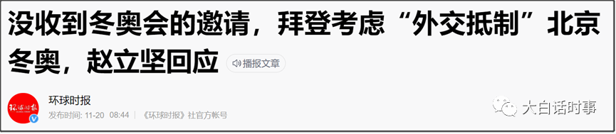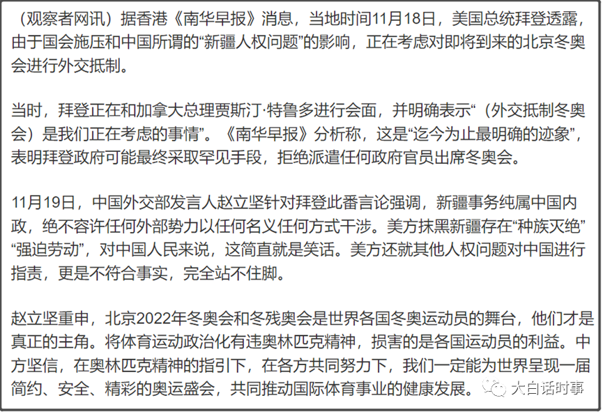 包括之前跟我们视频见面完,美国后脚马上采取老套路,让一些所谓知情人士故意透露消息给美国媒体称拜登会考虑对明年初冬奥会进行“外交抵制”。