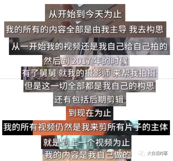 按照李子柒的说法,她的内容直到上一个视频都是她自己做的。