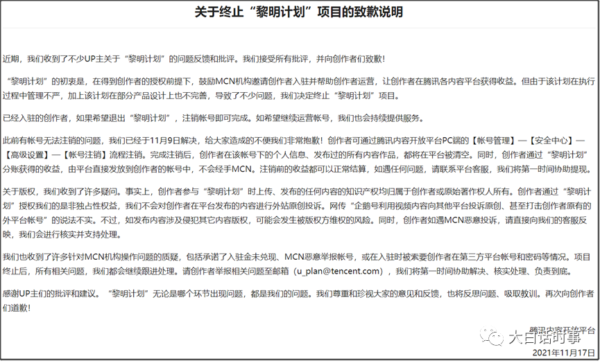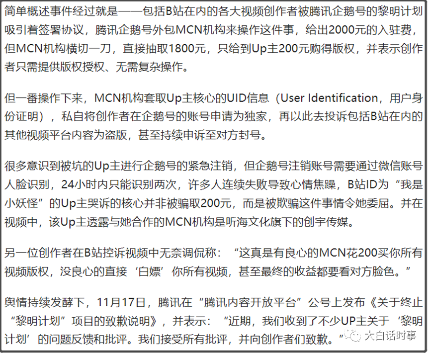 企鹅公开的致歉声明里是有提及,创作者通过“黎明计划”分账获得的收益,由平台直接发放到创作者的帐号中,不会经手MCN。