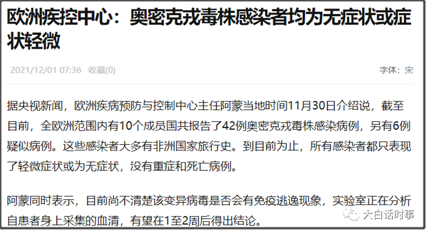 欧洲疾控中心表示,目前欧洲报告的42例奥密克戎感染病例,均为无症状或症状轻微。