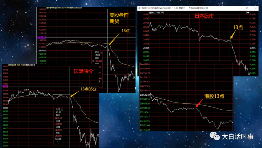 这句话导致,在周二中午13点整,美股的盘前期货,日本股市、国际油价、港股,等全球金融市场都很准时的出现集体跳水,跟上周五的集体跳水类似,只是幅度小了一些。