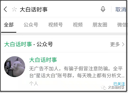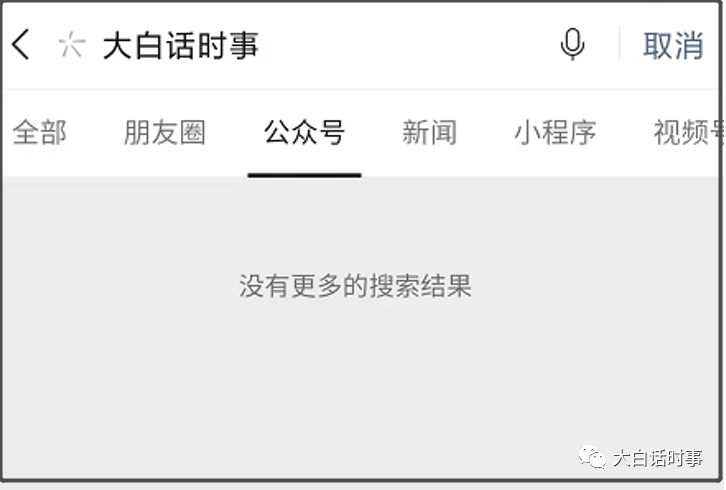 就是我在微信上搜我自己公众号“大白话时事”的时候,居然搜不到结果。