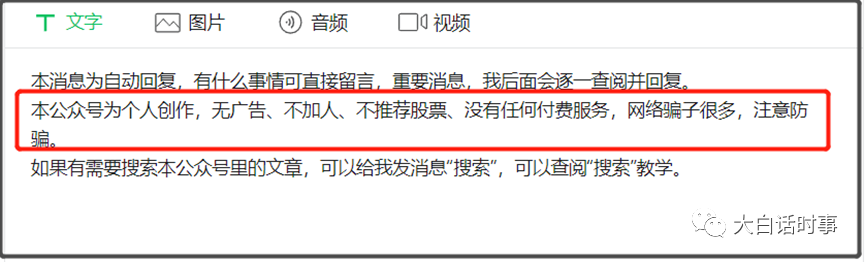 同时,我把被关注的自动回复,重点加上了这样一大段话,强调我“不建付费群,不搞个股推荐,不会主动加人微信,若涉及这些行为均为骗子假冒。”