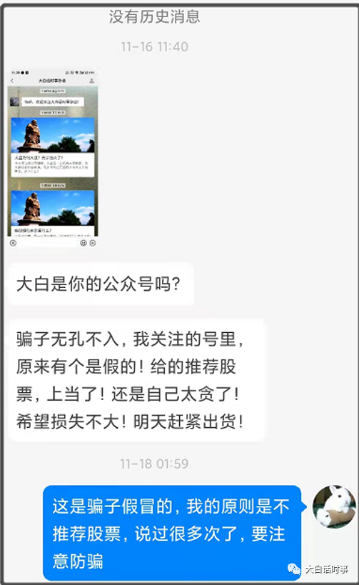 结果我一问,果然她是关注了那个假冒我的骗子公众号,然后把那个骗子当成是我,就听信了他推荐的股票去购买。