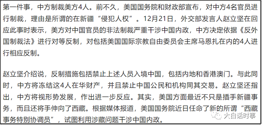 所以,这个12月10日,美国没有再派人给我们打电话,也没派人找我们见面,而是选择了连续密集制裁,这样有点恼羞成怒的发疯之举,我们就一点都不感到奇怪了。