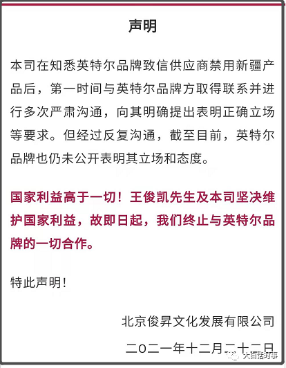 这件事情在引发国内很多人的愤慨后,影响也在不断扩大,包括王俊凯的工作室也是在22日晚上宣布“解除与英特尔品牌的一切合作关系”。