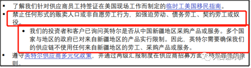 英特尔在这封信里,是直接在“禁止任何形式的贩卖人口或非自愿劳工行为”的这一点里,做了一个子分支称“英特尔需要确保供应链不适用任何来自新疆地区的劳工、采购产品或服务”。
