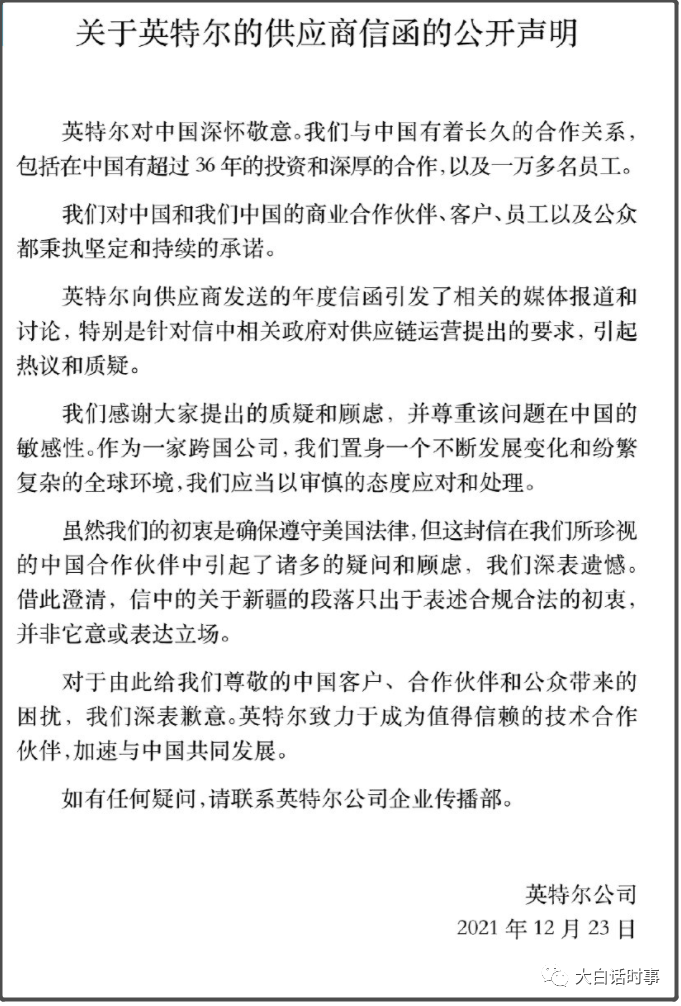 英特尔说“信中的关于新疆的段落只出于表述合规合法的初衷,并非它意或表达立场。”