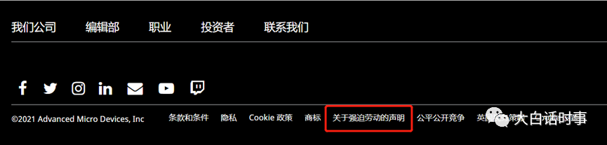 我们可以具体来看一下,比如说AMD在官网底部也有一个“关于强迫劳动的声明”。