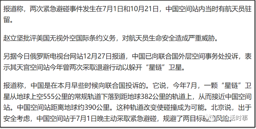 12月3日,中国通过联合国和平利用外层空间委员会(COPUOS)向联合国秘书长提交了一份照会,通报了美国太空探索技术公司(SpaceX)发射的星链(star1ink)卫星今年先后两次接近中国空间站,对中国空间站搭载的航天员生命健康构成威胁。
