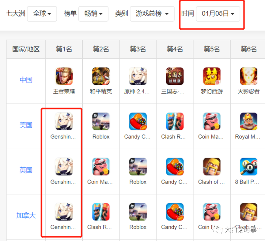 在1月5日《原神》更新版本的那一天,《原神》几乎霸榜各国的苹果畅销榜。