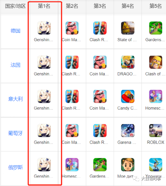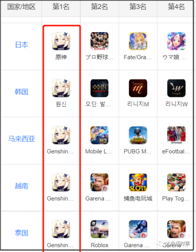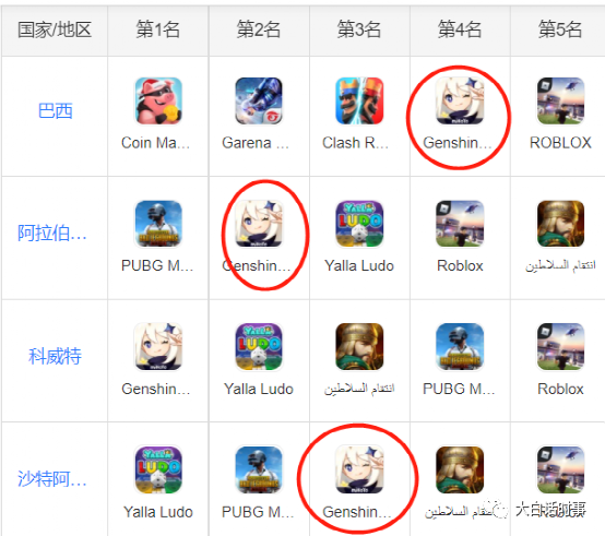 就连阿联酋、科威特、沙特这样的阿拉伯国家,《原神》居然都能挤进前5。