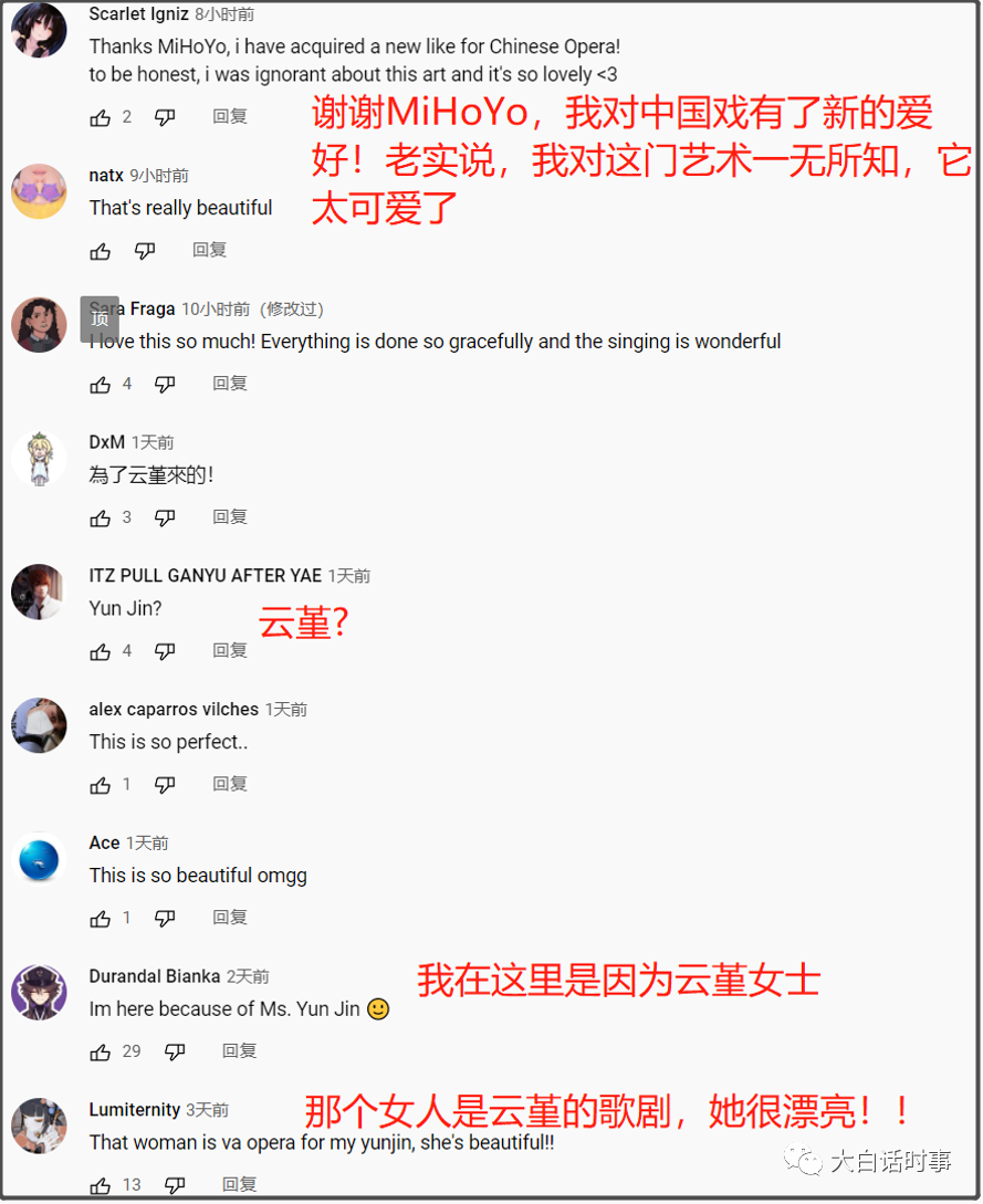 一些老外在这个7年前视频下留言,比如感谢米哈游(原神制作厂商)让她对中国戏曲有了新的爱好。