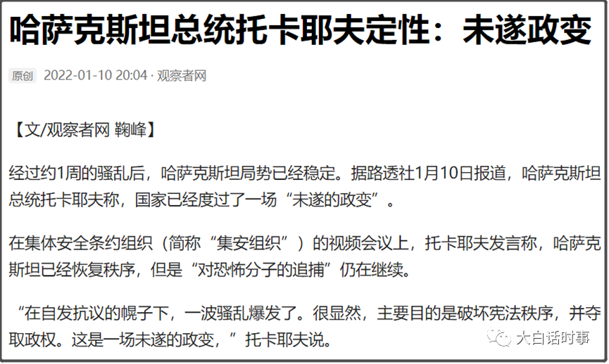 包括哈萨克斯坦现任总统托卡耶夫,昨天也是把这件事情定义为“未遂政变”。