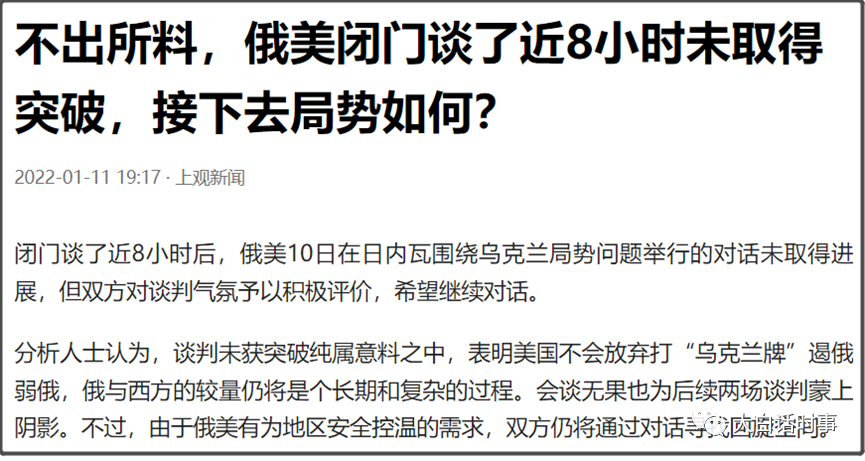 而恰好,就在10日,美国和俄罗斯举行了长达8小时的闭门会谈,围绕着俄乌危机展开对话。