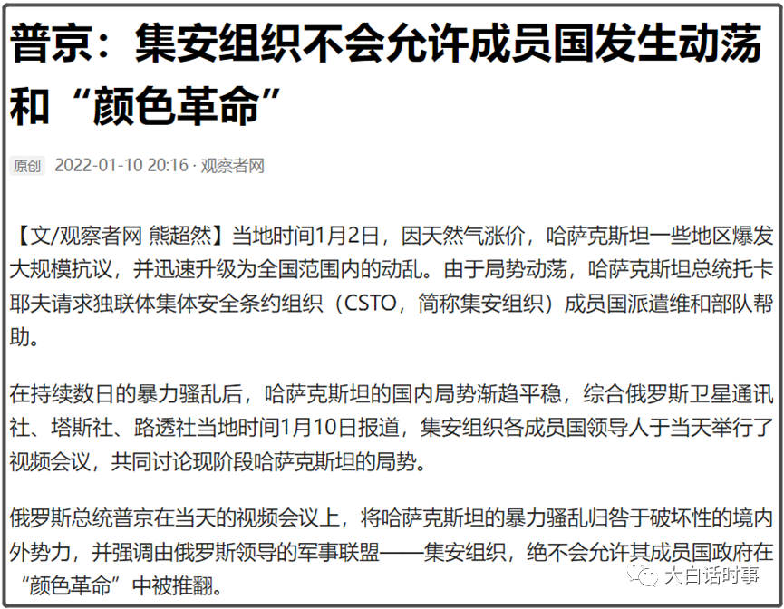 包括我当时也是直接说,集安组织会由俄罗斯迅速派出军队,这不是为了防范那些暴徒,而是防范纳扎尔巴耶夫铤而走险。