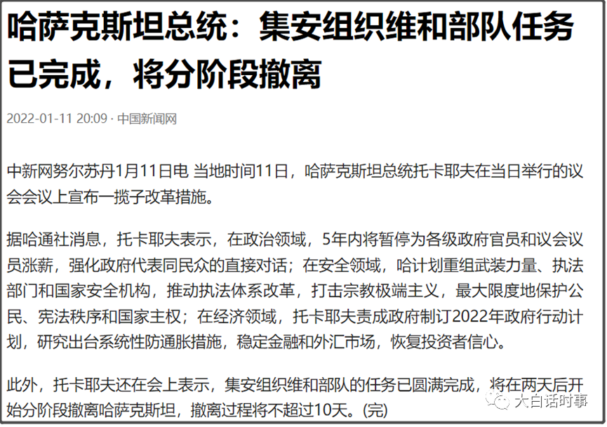 今天哈萨克斯总统托卡耶夫举行了会议,宣布了一揽子改革措施,并表示集安组织维和部队的任务已圆满完成,将在两天后开始分阶段撤离哈萨克斯坦,撤离过程将不超过10天。