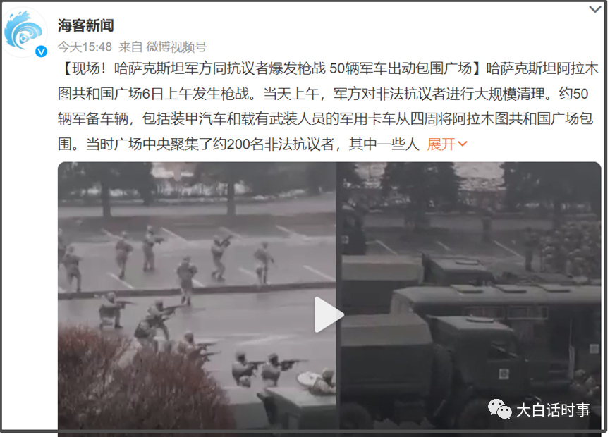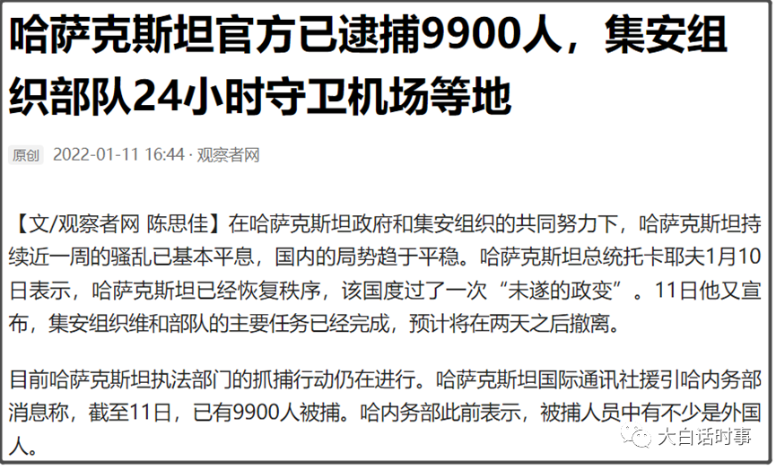 所以当哈萨克斯坦总统都开始向集安组织求援的时候,其实比较敏锐的人,都可以发现,这件事情已经有点脱轨。