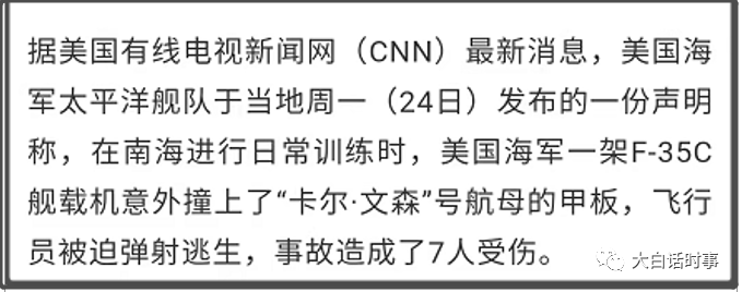 但十分倒霉的是,这训练才刚开始一天,24日美国海军就发表声明称,一架F-35C舰载机意外撞上了卡尔文森号航母的甲板,飞行员被迫弹射逃生,事故造成7人受伤。