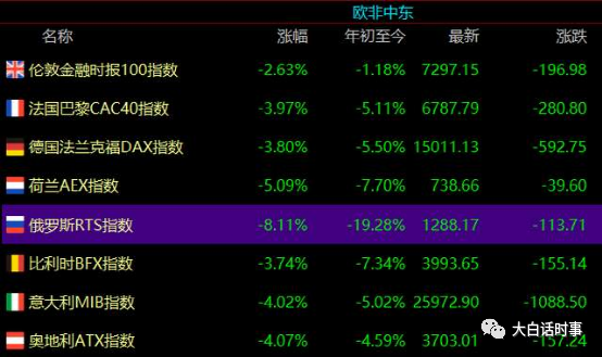 其中俄罗斯跌最惨,大跌8%,今年累计下跌幅度已经达到19%。
