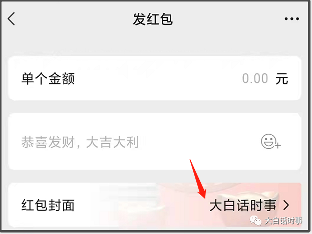 使用方法也很简单,在领了红包封面后,在发红包的时候,选择红包封面“大白话时事”就可以了。