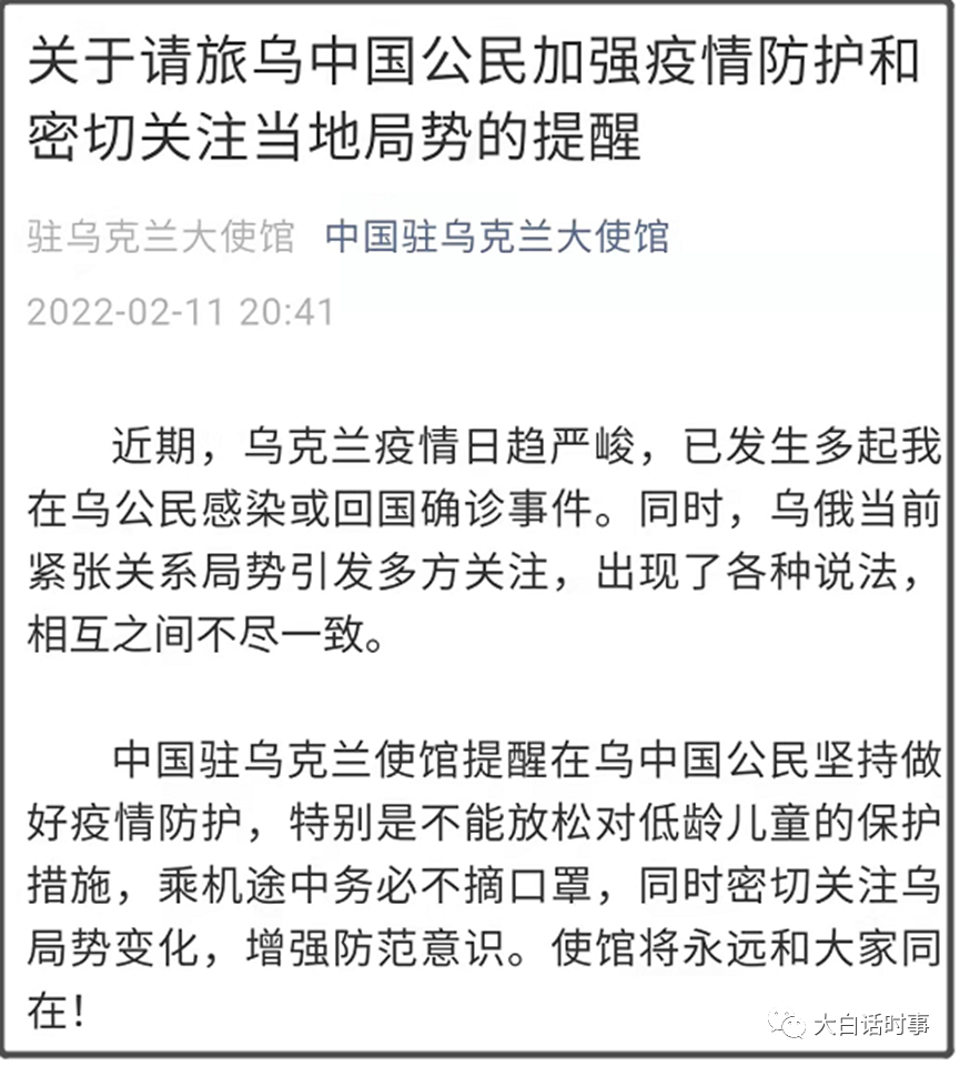 我们乌克兰大使馆在昨天发的提醒公告里,是把俄乌局势跟乌克兰疫情放在一块说。