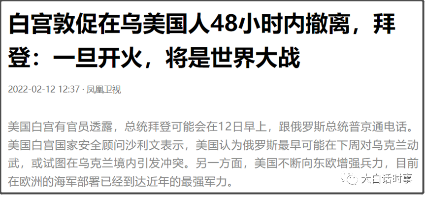 白宫不但要求在乌克兰的美国公民在48小时内撤离,拜登甚至直接说,“一旦如果俄罗斯和美国相互开火,世界大战随时可能爆发”。