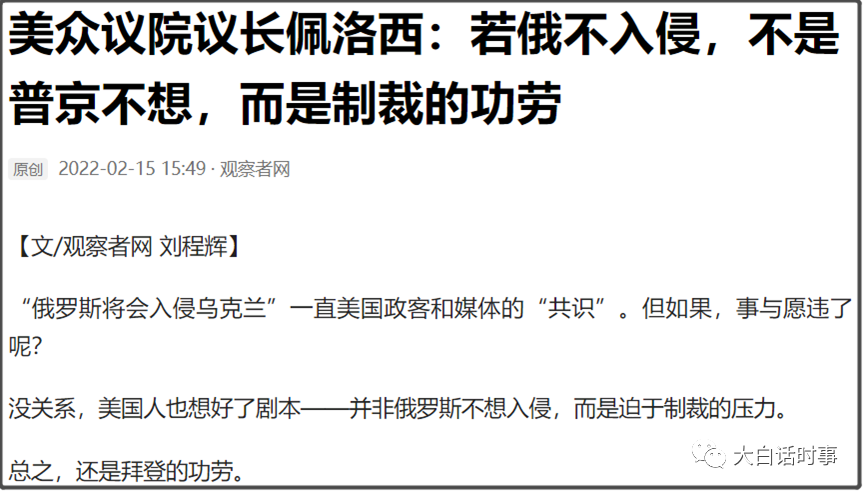 比如佩洛西就第一时间出来帮拜登邀功称“如果俄罗斯不入侵,不是普京不想,而是制裁的功劳。”
