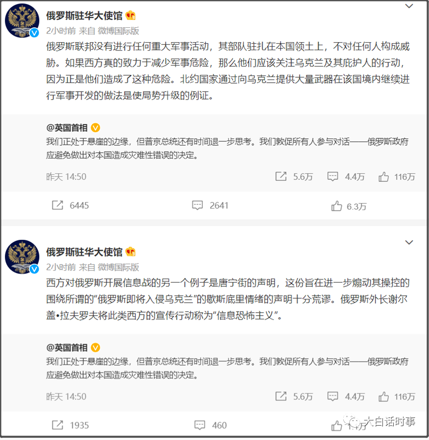 而且还出现神奇的一幕,英国首相约翰逊和俄罗斯驻华大使馆,居然跑到我们社交媒体来隔空喊话。
