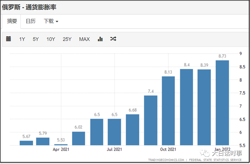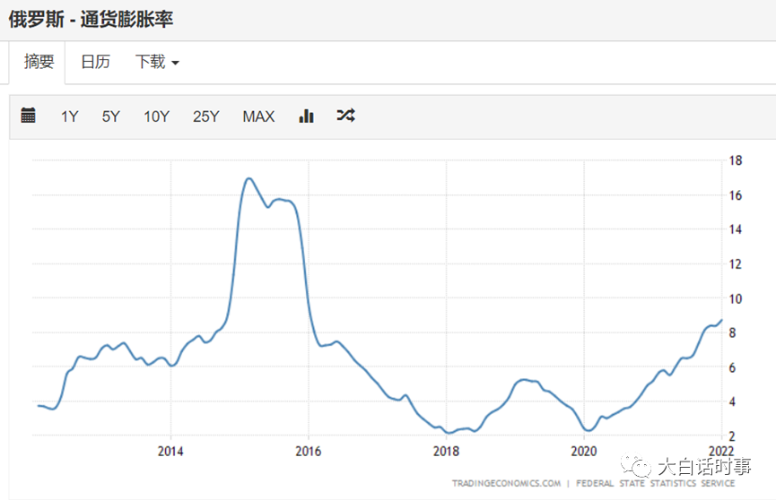 而俄罗斯之所以大幅度收紧货币,也是因为俄罗斯通胀率居高不下。