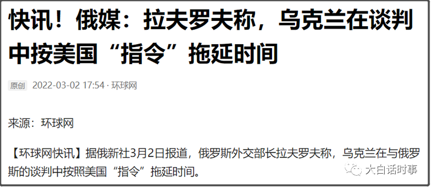 今天俄罗斯方面报道,俄罗斯外长称,乌克兰在与俄罗斯的谈判中按照美国指令拖延时间。
