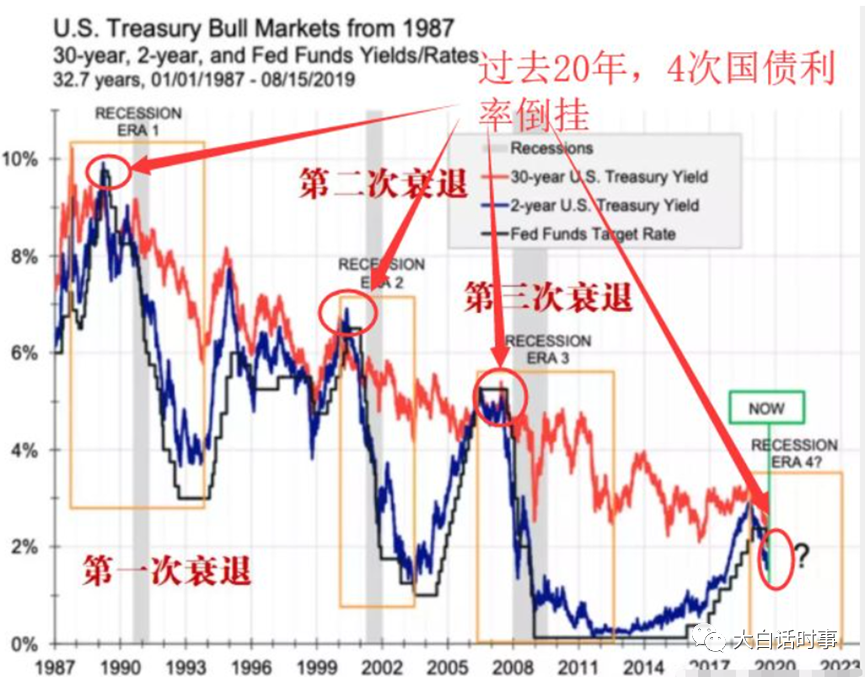 再比如,在2019年,美国2年期国债收益率,和10年期国债收益率,出现了严重倒挂现象。