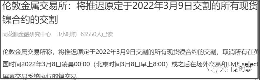 伦敦交易所宣布将推迟原定于3月9日交割的所有现货镍合约的交割,并且取消3月8日的镍交易。