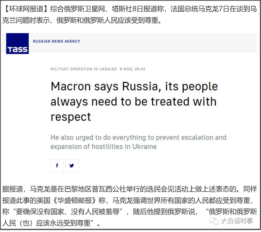 在3月7日,马克龙在谈到乌克兰问题时表示,俄罗斯和俄罗斯人民应该受到尊重。