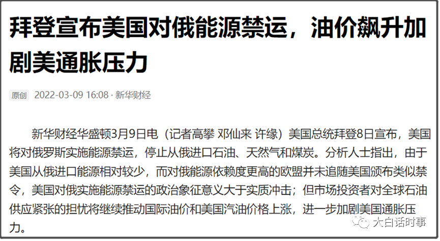 在3月8日晚上,拜登宣布美国对俄罗斯实施能源禁运。