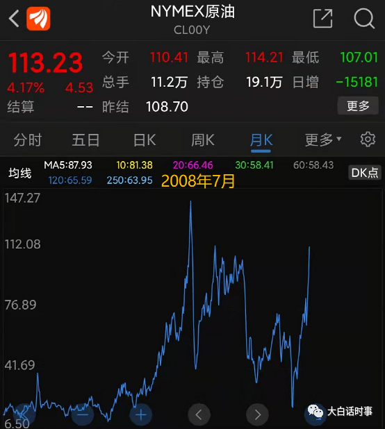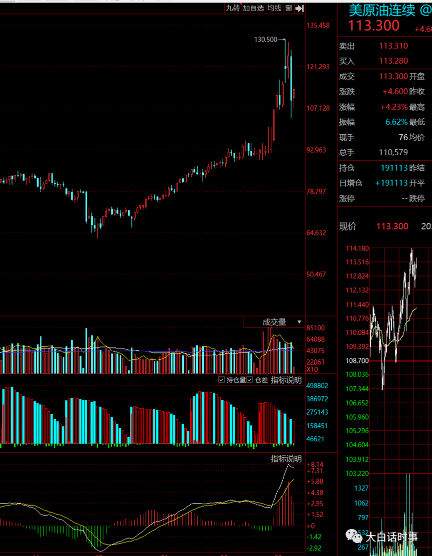 国际油价虽然在涨到130美元后,在3月9日晚上出现较大回落,但目前也仍然还在110美元上方。