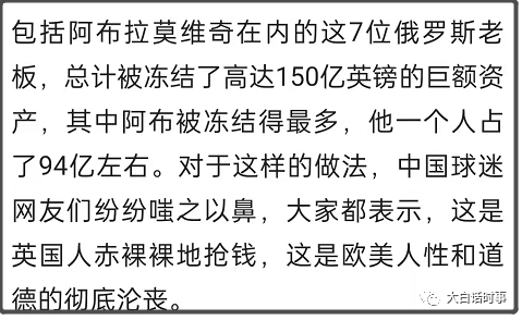 比较有名的像切尔西老板阿布的资产,已经被英国冻结,7名俄罗斯富豪已经被英国冻结了150亿英镑的巨额资产,阿布一个人就被冻结了94亿英镑。