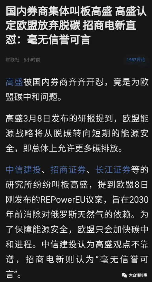 最近围绕着欧洲碳中和的事情,还引发国际大投行跟国内券商的论战。
