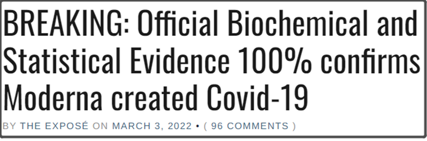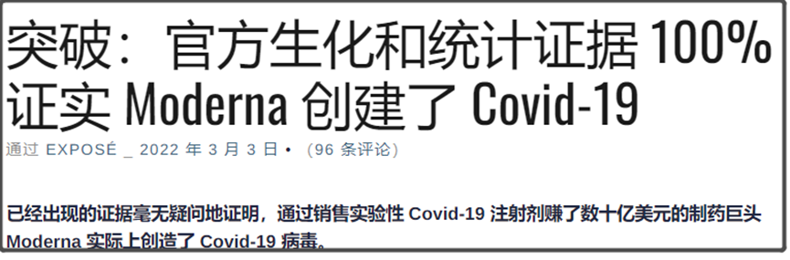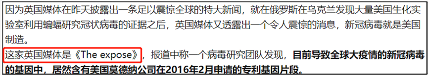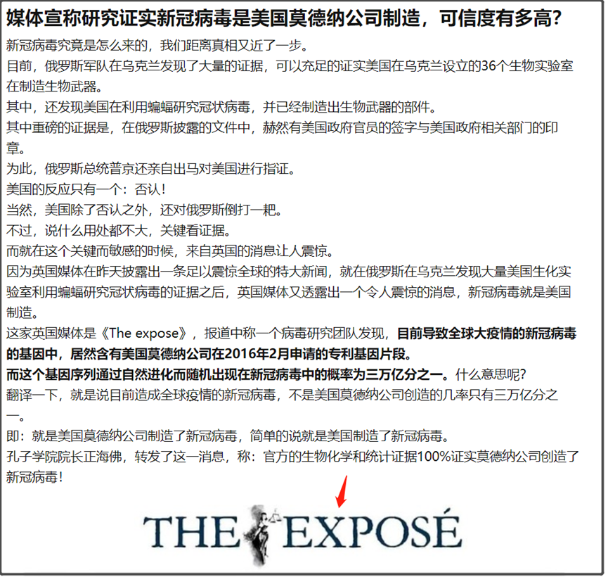“THE EXPOSE”这篇文章是直接写“已经出现的证据毫无疑问地证明,美国疫苗巨头Moderna实际上制造了新冠病毒。”