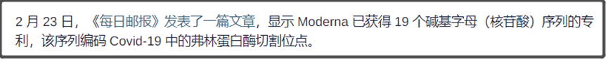 1、有研究者发现新冠病毒的一小块基因序列,跟莫德纳公司2016 年 2月申请的专利相匹配。