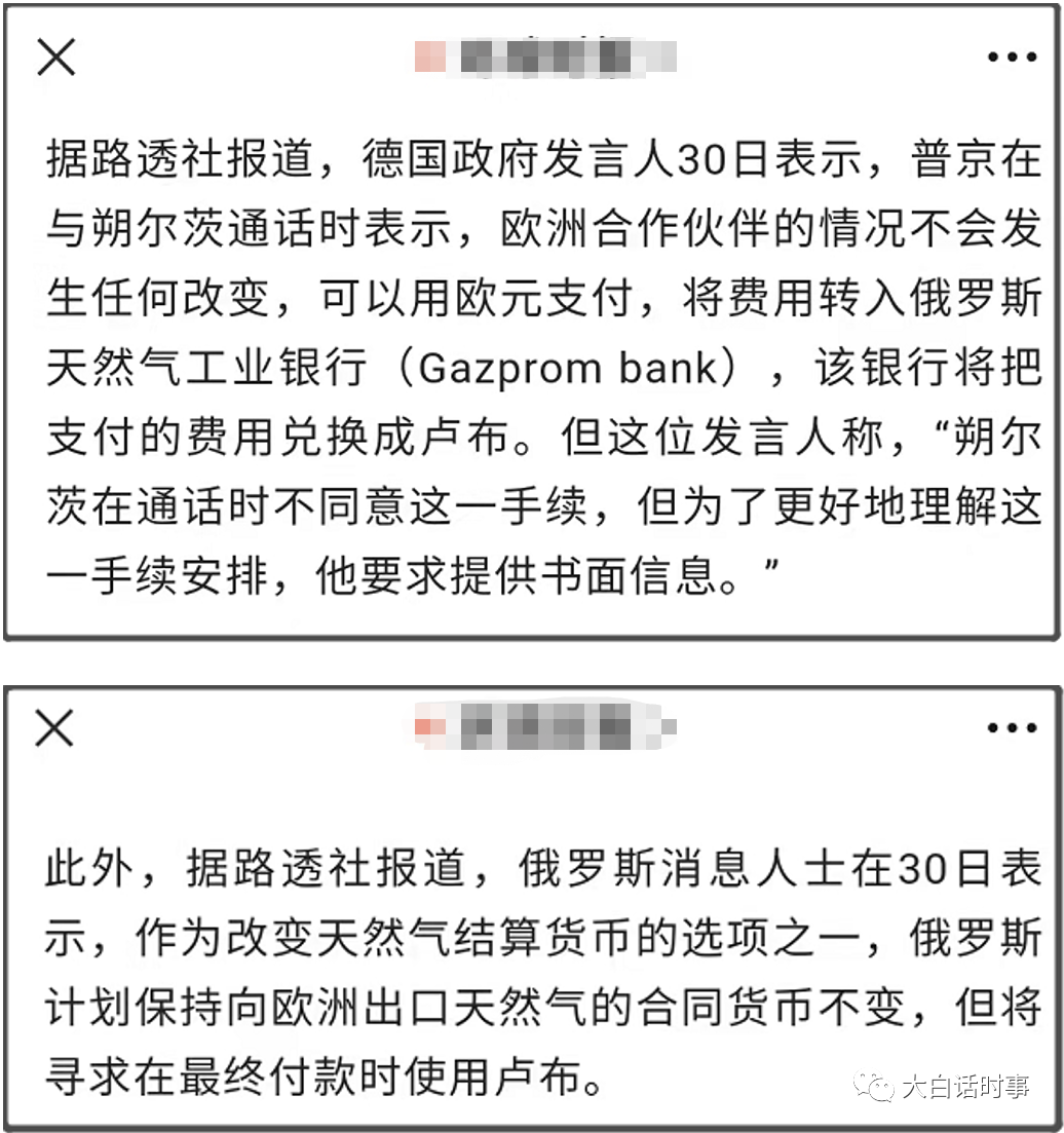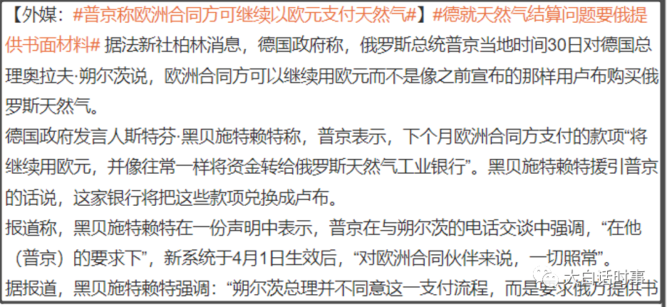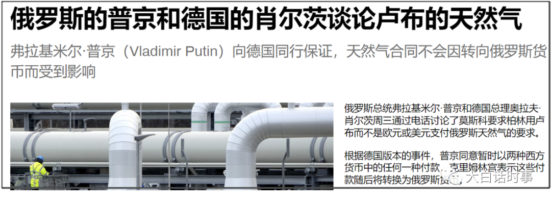 而且今日俄罗斯的“摘要”也是写普京向德国同行保证,天然气合同不会因转向俄罗斯货币而受到影响。