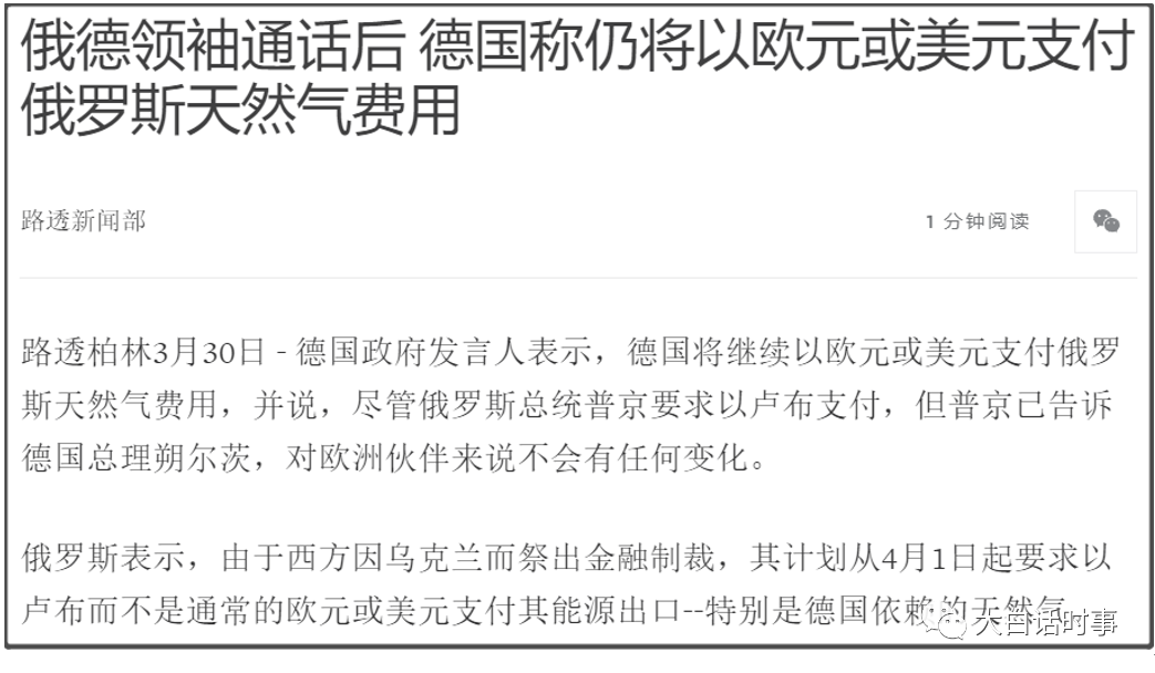 甚至像下面这个报道,标题自己写着“德国已经得到俄方的保证”,并且摘要里还提炼成“欧洲目前不需要用卢布支付天然气”,“欧洲公司刻意继续用欧元或美元支付天然气”。