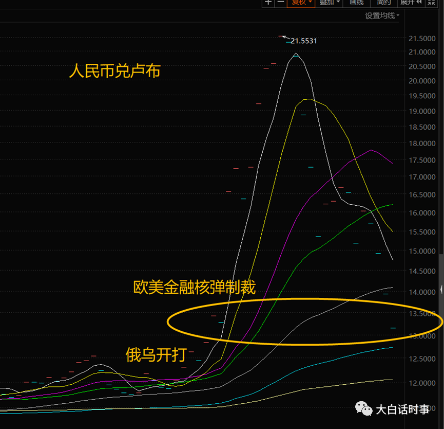 在被欧美踢出SWIFT,搞金融核弹制裁后,卢布一度大幅度贬值到1人民币兑换21.5卢布,跌了接近一半。