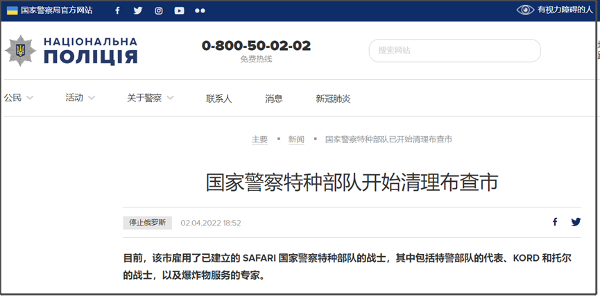 在4月2日,乌克兰国家警察局网站,曾经发表新闻称“开始清理布查”,乌克兰特种部队清除了城市里的破坏者和与俄罗斯军队的勾结者。